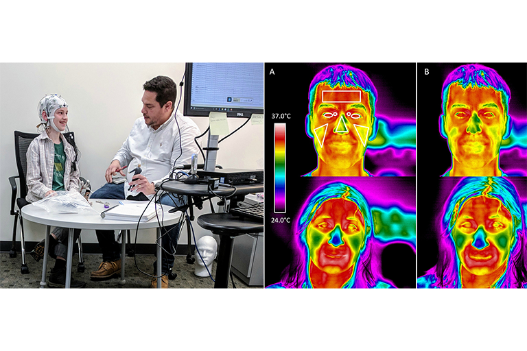 In this project we are simultaneously measuring EEG and thermal changes in the face in children during the administration of the Autism Diagnostic Observation Scale, 2nd Edition (ADOS-2)—a semi-structured social interaction that measures ASD-specific behaviors. The overarching goal of this research is to identify mappings between (neuro)physiology and clinical manifestations of autism. Children who participate in this study will wear a light-weight wireless EEG cap (left image above) and take several thermal images (right image above) of the participant during the ADOS-2.